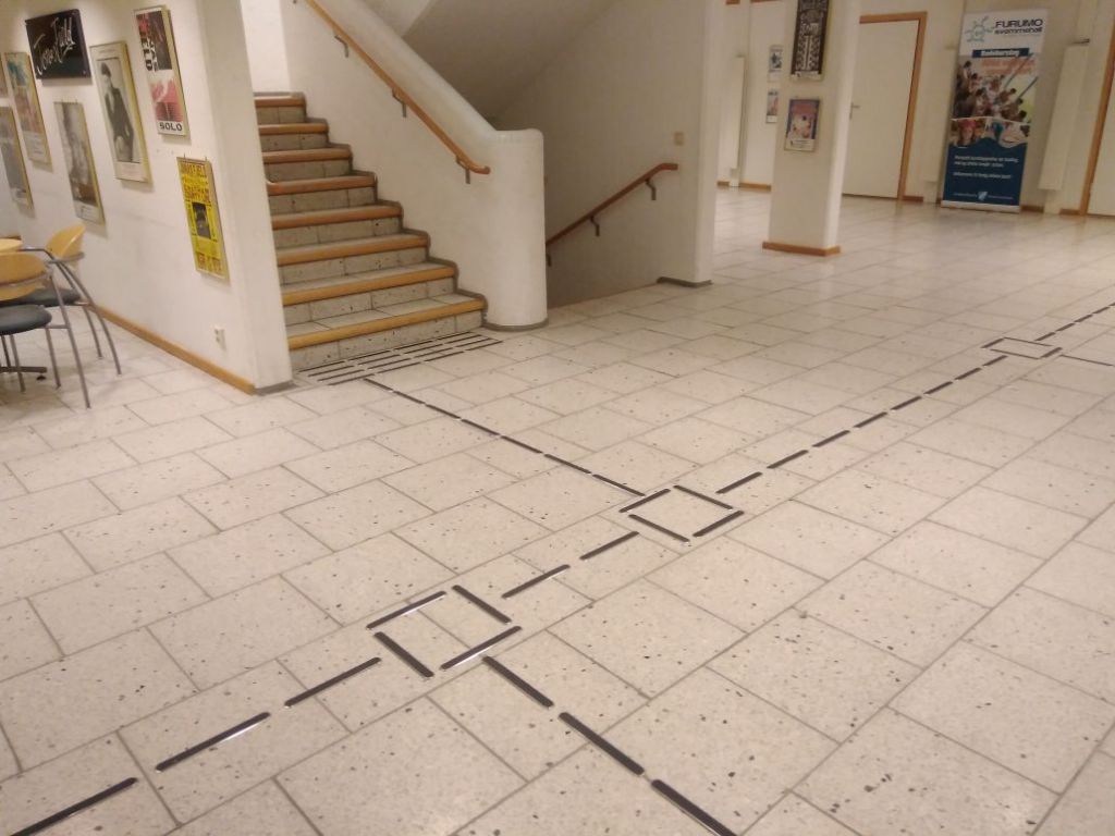 - Ledelinje, typisk fra hovedinngang til byggets mest sentrale funksjoner. (Resepsjon, billettautomat, HCWC, heis)