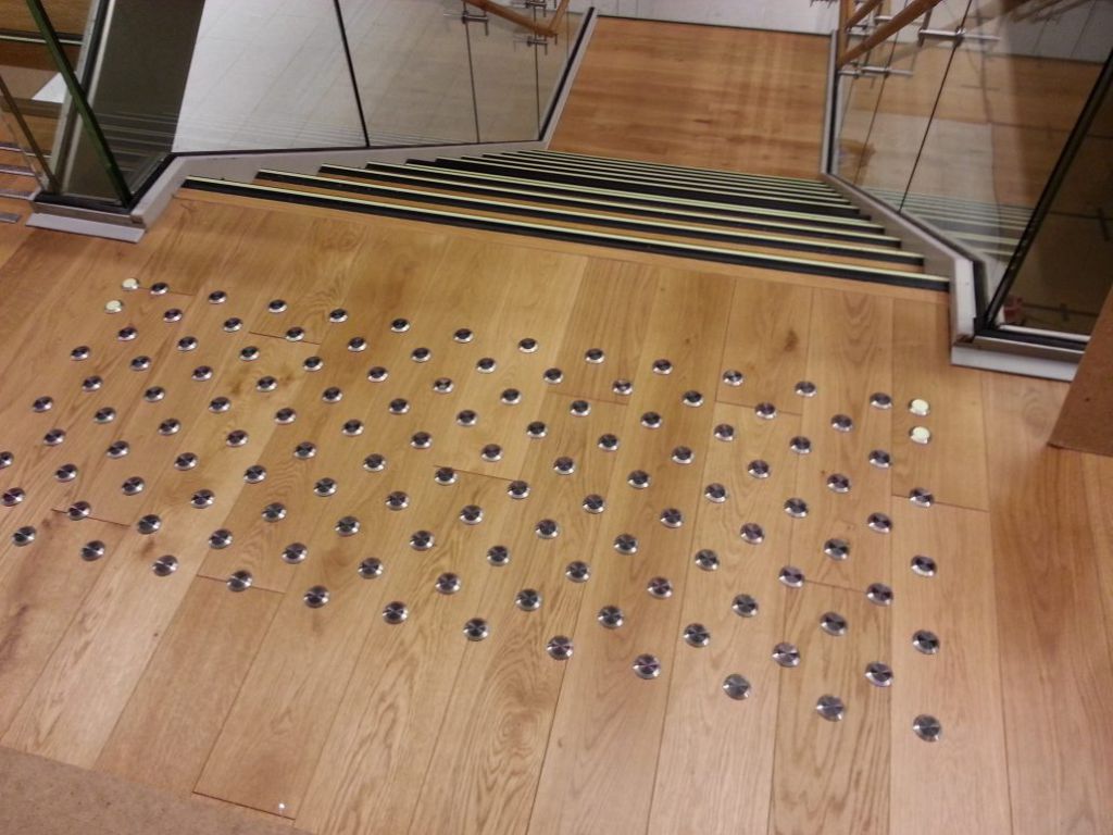 - Farefelt, øverst i trapp. Farefeltet varsler slik at den blinde eller svaksynte blir varslet om fare.